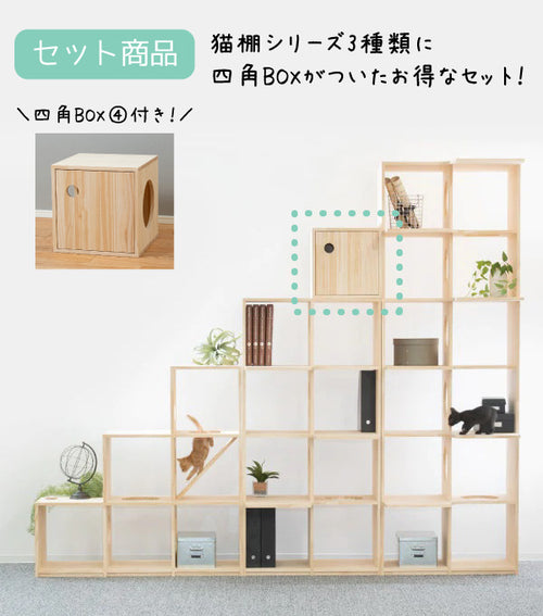 「猫ハウス 六角BOX」のオープン2つ、小窓1つ、大窓ボウル付1つの計4つが1セットになりました。製品同士の連結固定をして多様な形を作りましょう。