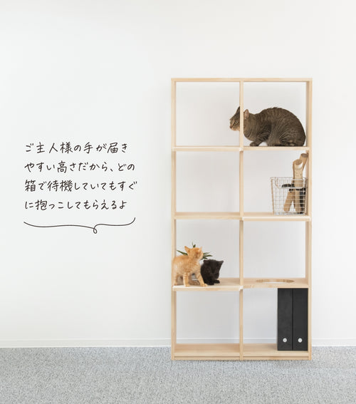 自由に形を決められるので、高い所が苦手な子猫様や高齢猫様にもおすすめです。最大2段になる組み合わせでも隠れんぼや追いかけっこ、お昼寝などに最適です。